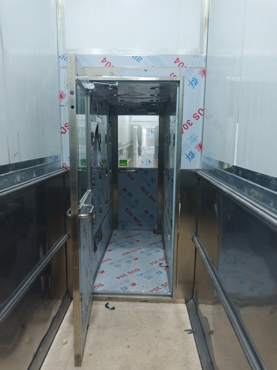 3、如果走廊位置比較緊湊,這種風(fēng)淋室在測(cè)量現(xiàn)場(chǎng)的時(shí)候尤其需要注意。尤其是鈑金型風(fēng)淋室,因?yàn)槌叽缫筝^高,我們?cè)跍y(cè)量的時(shí)候應(yīng)該多選幾個(gè)點(diǎn)進(jìn)行測(cè)量。前后測(cè)量,其次由于土建墻存在偏差,我們需要對(duì)土建墻的高低進(jìn)行測(cè)量。最后取最小值,以免風(fēng)淋尺寸過大而無法安裝進(jìn)去。